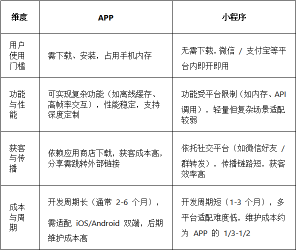 在軟件開發(fā)領(lǐng)域,APP 與小程序是企業(yè)觸達(dá)用戶的兩大核心載體。二者并無絕對 “優(yōu)劣”,選擇需緊扣業(yè)務(wù)需求、用戶場景與成本預(yù)算,以下從核心維度拆解關(guān)鍵差異,助企業(yè)快速決策: